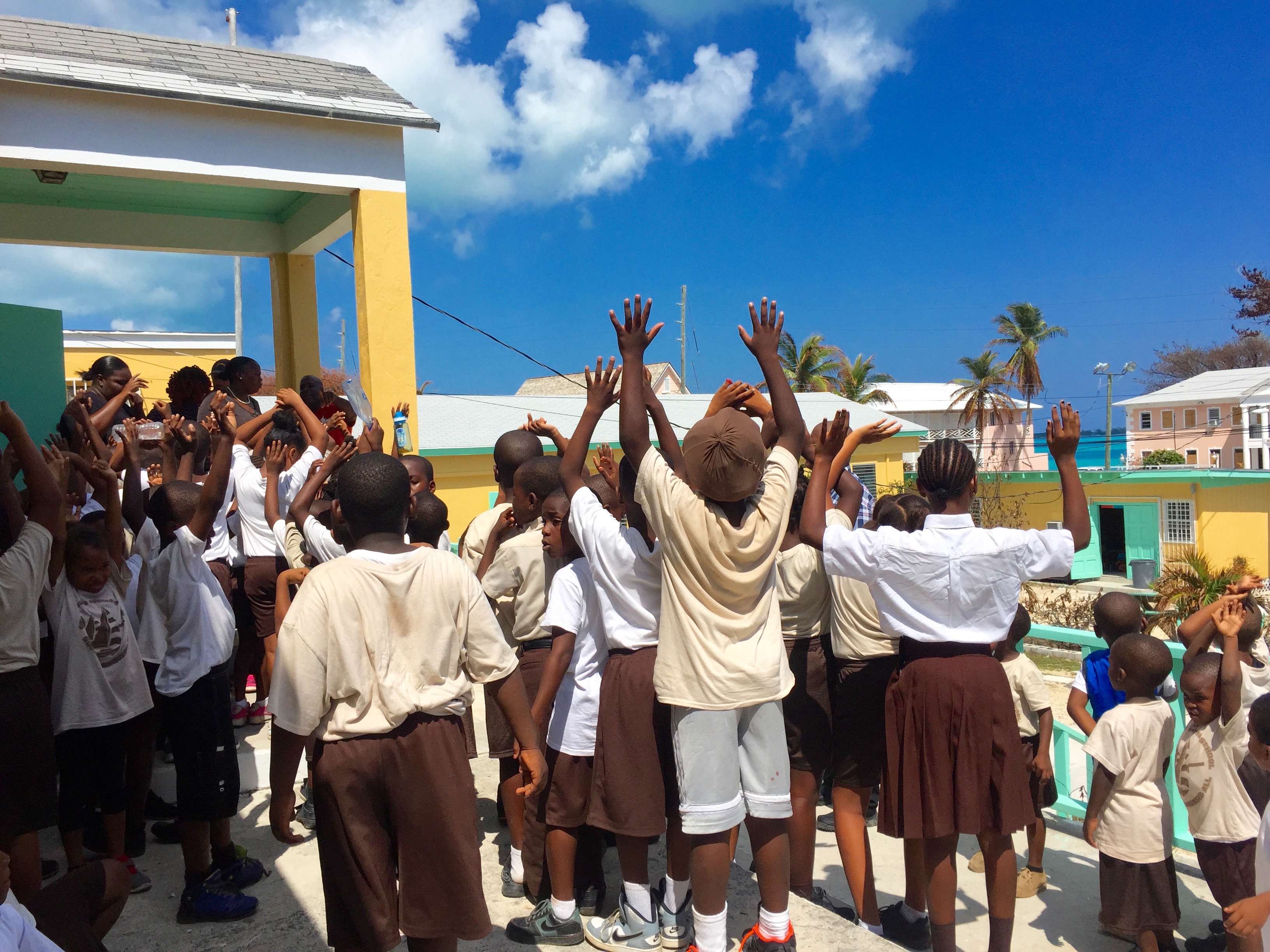 Tyrone Monroe (R) and Kevin Taylor (L) engage with students at Georgetown Primary this morning.